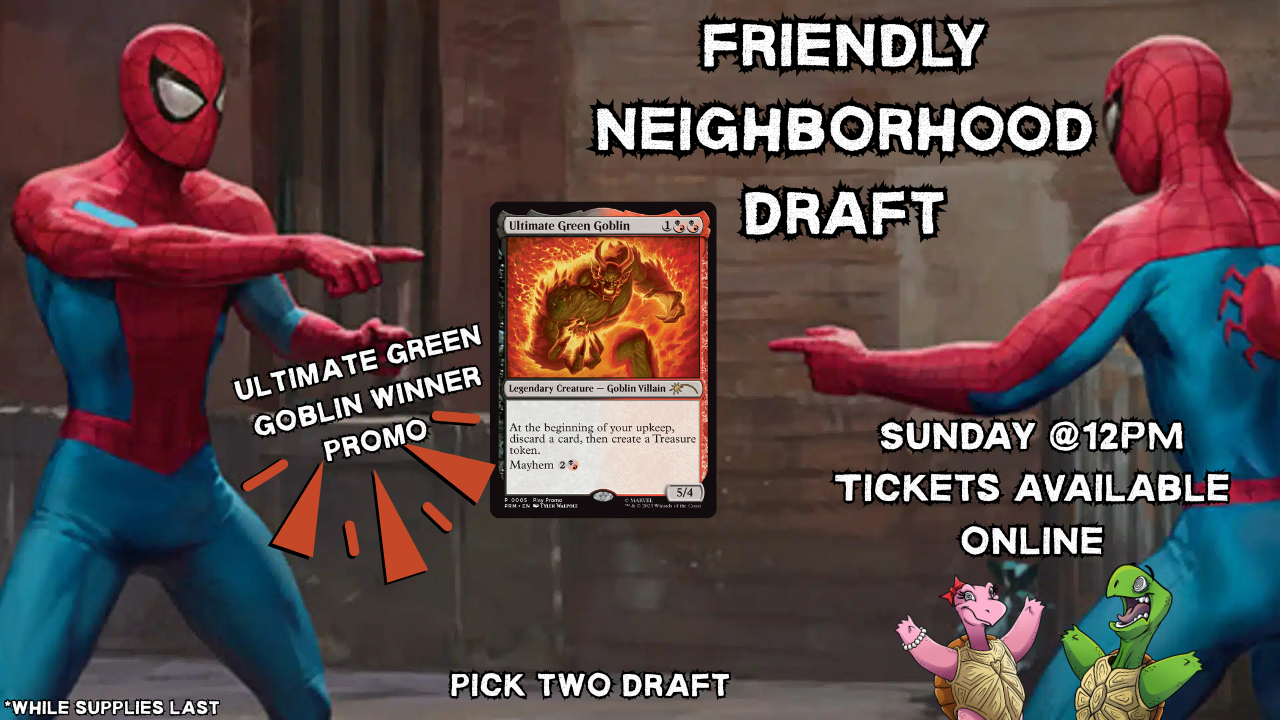 Join us for a Spider-Man 4 player per pod event! You will draft an entire box between 4 people untill at the packs are gone and build a 40 card deck. You will then compete in a 2 round swiss-style tournament. Top winners will take home promos & Spider-man Prizing!