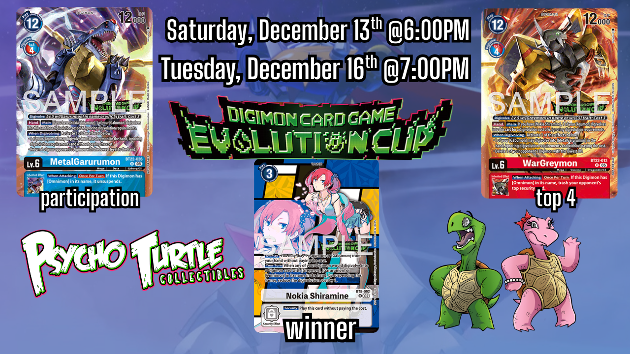 Evolution Cup is a competitive store tournament which offers players the chance to compete for special prizes! Join an Evolution Cup event and test your skills!
